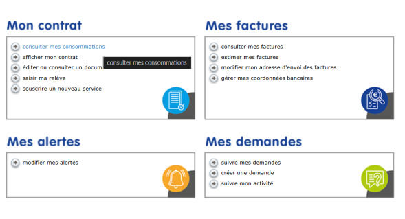 Une fois votre compte créé, vous pouvez accéder à votre agence en ligne. Vous avez accès à plusieurs outils, notamment la consultation détaillée de vos données de consommation issues du compteur communicant et la gestion de vos factures. Vous avez accès à vos consommations mensuelles ou journalières, avec des graphiques permettant de comparer des périodes.
