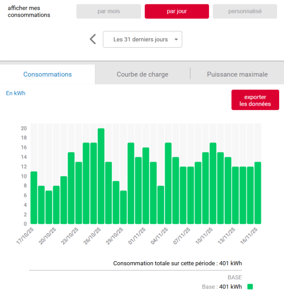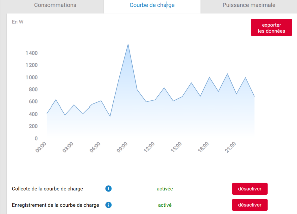 Si vous souhaitez avoir accès aux données de votre courbe de charge (données plus fines permettant de visualiser la répartition de votre consommation sur la journée), il faut activer la fonction depuis votre espace client. Cette activation peut nécessiter un délai de prise en compte avant l’affichage des premières données.