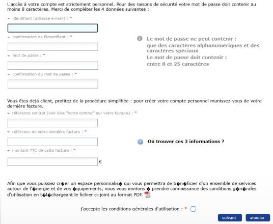 Si vous n’avez pas de compte de créé, il faut vous munir de votre dernière facture d’électricité et renseigner votre numéro de contrat, la référence de votre dernière facture et le montant de votre dernière facture. Il faut ensuite créer vos identifiants de connexion (adresse e-mail et mot de passe) et valider votre inscription.